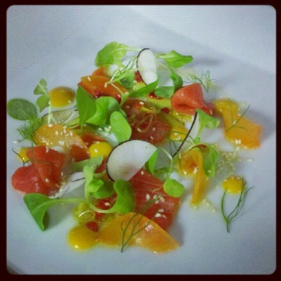 I finished icing the cake just in time to go pick up Laura’s best friend, Caroline. In the two weeks prior, I had actually planned on going to dinner at the restaurant in DC, where Laura works, and surprise her. Laura was working the Garde manger station that night, so she made all the cold appetizers we had at the start of the meal (without her even realizing). Caroline and I loved the food, particularly this starter of salt cured smoked salmon.