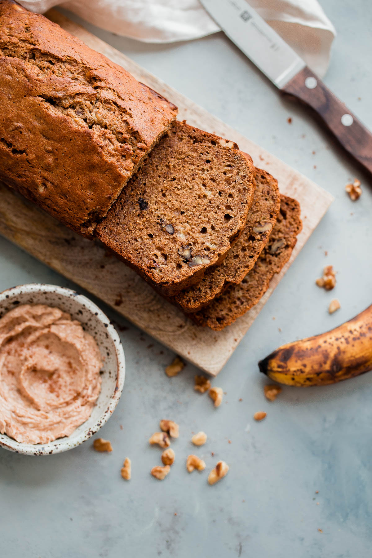 Let’s call it healthyish, ok? It’s a banana bread that we can justifiably eat for breakfast on a busy day (or as a quick afternoon snack!) and one that won’t leave us with a sugar coma. All good things. As a little optional side bonus, I’m sharing a fun and simple spiced walnut butter to serve alongside it.