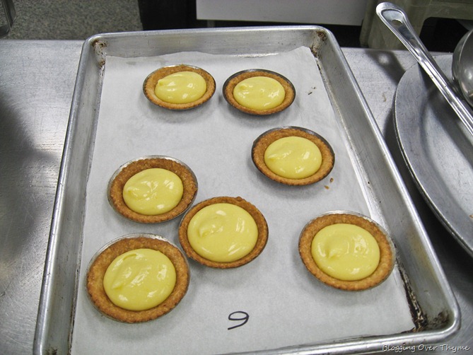 We made tiny little tartlets, which were probably about an inch-and-a-half in diameter. After molding, we blind baked them before adding our filling, which was a classic curd. I am obsessed with tart lemon anything—so this was right up my alley!