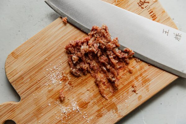 - Make the Caesar Dressing: Place the drained anchovy fillets and garlic cloves on a cutting board. Sprinkle lightly with kosher salt. Finely chop together, using the side of a knife to mash into a paste.