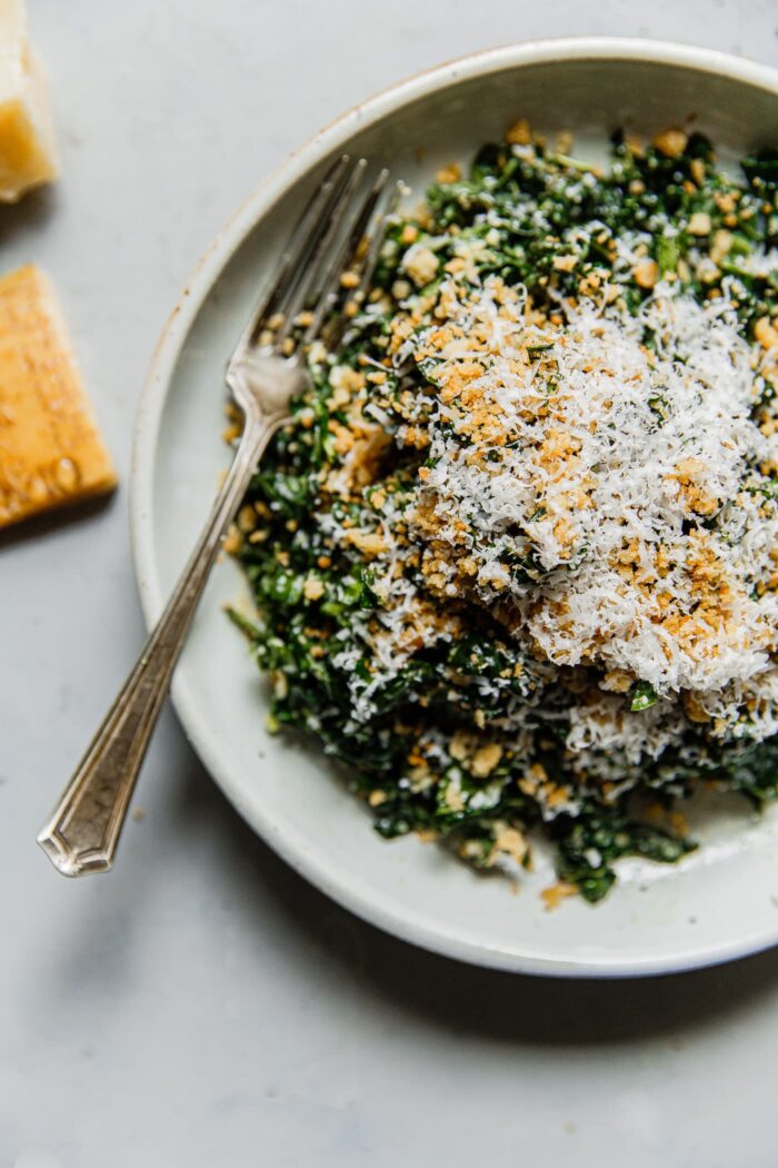 - Assemble the Salad: Gently toss the kale with just enough dressing to evenly coat the leaves (note: you will have leftovers!). Season to taste, adding more salt and freshly ground black pepper as needed. Top each serving with crispy garlic bread crumbs and a dusting of parmigiano-reggiano cheese (grated finely with a microplane). For a hearty main course, serve alongside sliced hard boiled eggs, if desired.