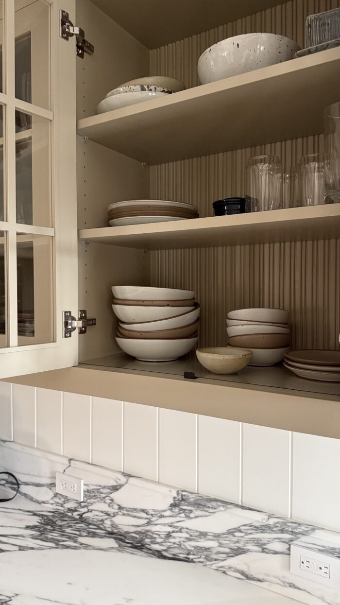 A heavy duty pullout storing my heavy stand mixer (we added plugs at the back, so this could be multi-use – however, I mostly use it to easily grab and carry to my countertop). This wall of cabinetry has pocket doors that can be left open or closed for a streamlined, tidy look.