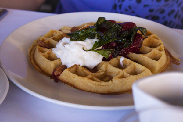 {Brunch at Flora: Cornmeal waffle with burrata, roasted strawberries, almonds, and fried basil}