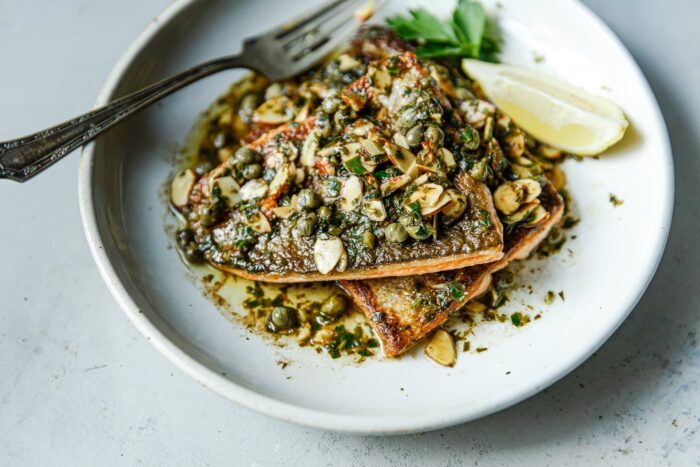 - Finish: Add the capers, parsley, and lemon juice and immediately remove from the heat. Season with salt and pepper to taste. Spoon the sauce on top of the trout and serve immediately.