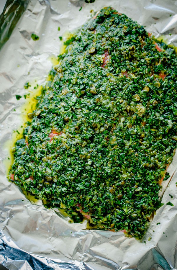 I couldn’t help but give my chermoula a little bit of a Mediterranean twist with the addition of capers, because I love capers (they are salty, briny, and wonderful) and they are one of salmon’s best flavor friends [did I just say that?].