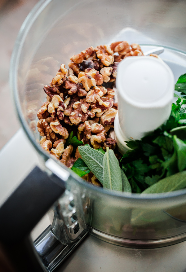 The homemade walnut-sage pesto was my favorite part of this dish and requires only a handful of ingredients: flat-leaf parsley leaves, fresh sage, lots of walnuts, fresh garlic, and..wait for it…roasted walnut oil (in lieu of traditional olive oil)!
